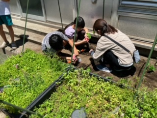 教室で育てていたツルレイシの苗を、花壇に植え替えました。これから育ち方の観察が続きます。