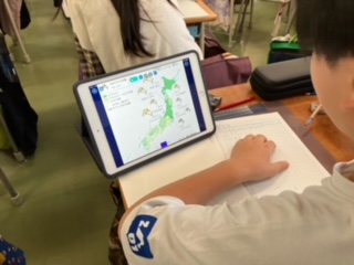 日本の農産業の学習。お米の袋を持ち寄って、日本地図で産地の確認をしていました。