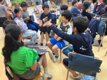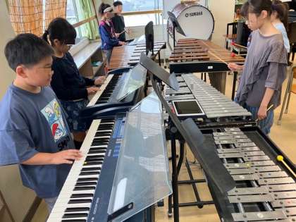 グループに分かれて、担当楽器の相談。パートの構成についての工夫を相談し、実際に楽器で音合わせをしながら学習を進めていました。