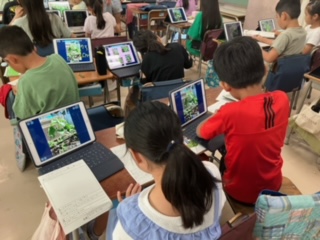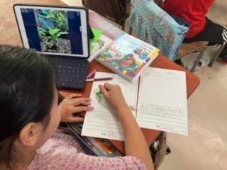 校庭で育てているホウセンカの記録カードを描いていました。タブレットで撮った写真をもとにしながら描いていました。