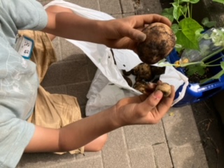 いっぱいのじゃがいもが収穫できました。一番大きいのと一番小さいのを比べて見せてくれました。