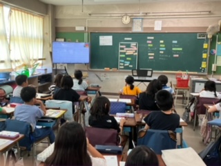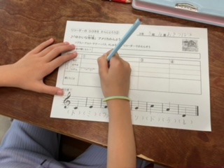 音楽鑑賞の学習。曲を聴いて、使われている楽器やリズムをまとめていました。