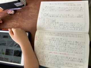 身の回りにあるユニバーサルデザインについて調べたものについて、報告文をレポートとしてまとめる学習。本やインターネットを使って資料集め、報告文にまとめていました。