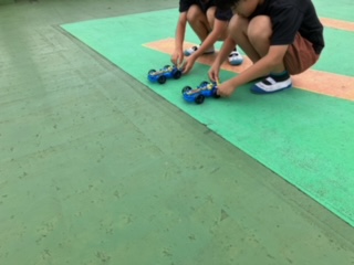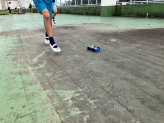 電池で動くモーターカーがとうとう完成です。みんなで屋上で走らせて楽しみました♪