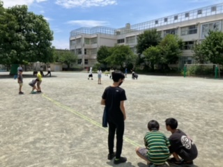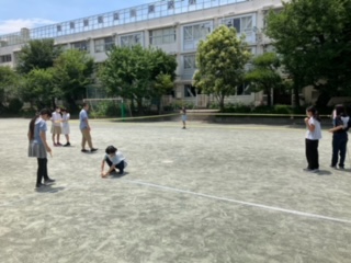 「一辺の長さが、3:4:5の三角形は直角三角形である」という定理を使って、校庭に大きな正方形を描くという課題。うまくいくかな?