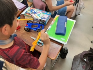 説明書を見ながら組み立てています。得意な子が苦手な子に教えながら、わいわいと楽しそうに進めていました。