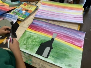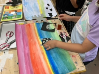 色の三原色で作り出したレインボーの上に、黒と灰色の画用紙を貼って作品に仕上げていきます。素敵です。
