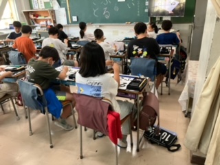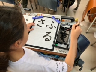 集中して筆で文字を書いていました。平仮名の柔らかさを表現するのは難しいのですが、上手に書けていました。