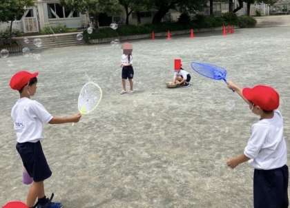 校庭でシャボン玉を作って楽しんでいました。ストローだけでなく、針金で輪を使ったものや、うちわの骨だけのものを使って、いろいろなシャボン玉ができました。