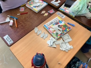 みんなで釣りゲームを作ろう。ということで、カニやお魚のイラストを切り抜いて準備をしていました。