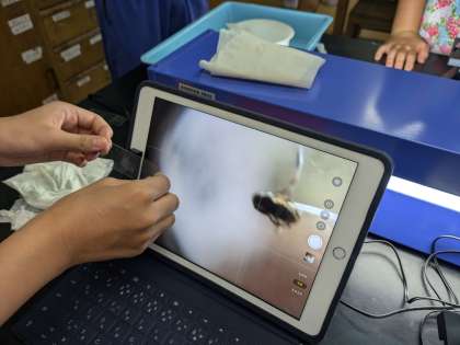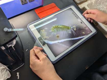 学校の池から採取した微生物を顕微鏡で観察しました。ミジンコなどの微生物がくっきり見えて、子供達から驚きと歓声が上がっていました。タブレットにつける拡大レンズを活用して、顕微鏡を使わなくても観察することもできます。
