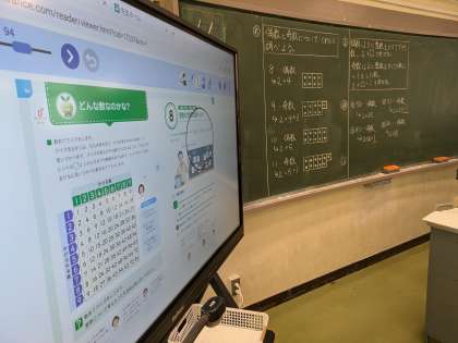 5年2組の教室に新しい電子黒板が入りました。画面がとても大きく、直感的に操作ができ、視認性がとても高いです。ICT機器を活用して、より分かりやすい授業を目指していきます。
