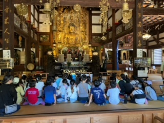 お釈迦さまのいらっしゃる本堂で、お坊様のお話を聞きます。