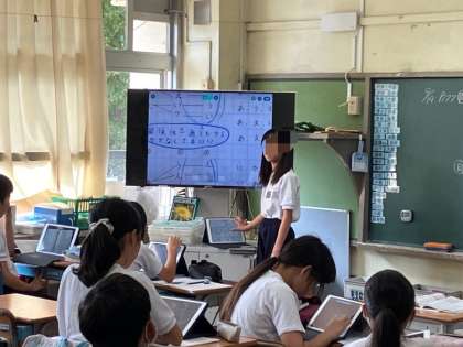 自分の考えをタブレットでTVに写し、みんなの前で発表していました。