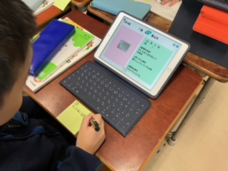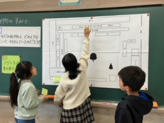 前に見つけた昆虫が、校庭のどこにいたのか、付箋に書いてペタペタと貼っていきました。
