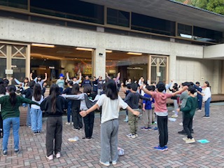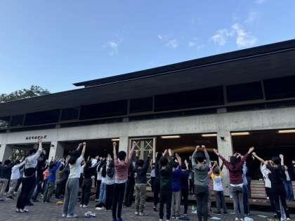 朝のラジオ体操。青空の下、気持ちよく体を伸ばします。