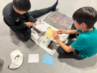 次のプログラムは、間伐材を使ったお箸作りです。杉の木をヤスリで削って作っています。