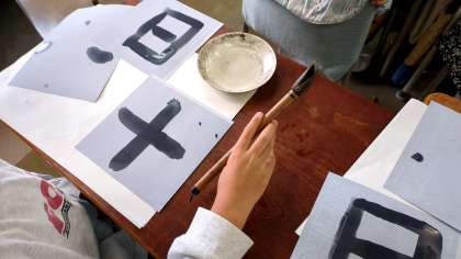 2年生の教室では水で書ける半紙を使って、毛筆の練習を行っていました。3年生で本格的に学ぶ毛筆の運筆について、子どもたちは集中して真剣に学んでいました。