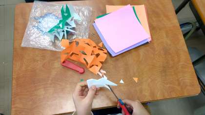 2年生の教室では、折り紙を折ってからハサミでランダムに切り込みを入れることでできる幾何学模様のコースターを作っていました。