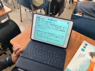 今日の道徳のテーマでした。それぞれの考えをタブレットでまとめ、みんなで共有していました。