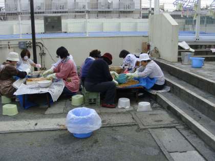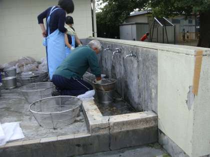 今年で5回目になる『ふかさわぎんなんまつり』のためのぎんなん洗いが,保護者のみなさんや地域のみなさんによって始まりました。台風17号と19号の風や雨で落ちた実を主事さんたちが集めた実は,10Lくらいずつビニル袋に入れたものが30袋以上あります。みなさんの手で,一つ一つきれいに洗いあげられていきますが,ぎんなん特有のにおいもあり,作業はとても大変です。しかし,こうして支えてくださる皆さんのおかげで,ぎんなんまつりに集まった方々に配ることが初めてできます。感謝の気持ちでいっぱいです。