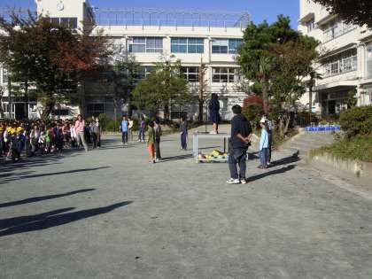すっきりした青空の下、全校が集まって、児童集会をしました。後期の集会委員会の初めての取り組みでした。
