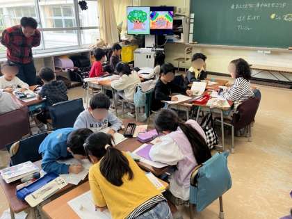 展覧会を見に行った後、お友だちの作品の素敵だなと思ったところをカードに書いていました。カードは、お手紙としてお友だちに渡す予定のようです。