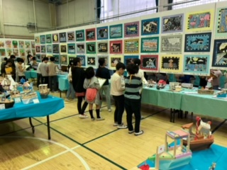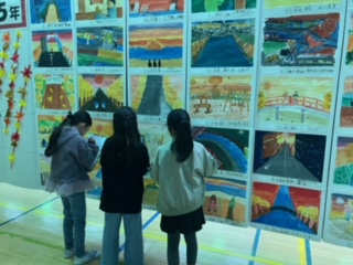 4年生の子たちが展覧会の鑑賞をしていました。いろんな学年の作品を見て、鑑賞カードに記入しています。