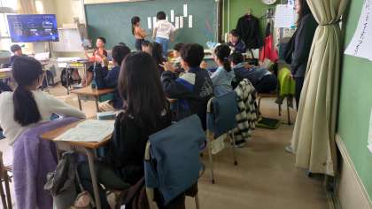4年生の学活では、お楽しみ会で何をするかについて話し合っていました。机をカタカナの「ロ」の字型にして、子どもたちが司会や書記になって話し合いを進めていました。