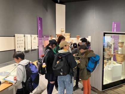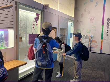 縄文時代の始まりについて展示物を見たり、係の方に質問したりしています。