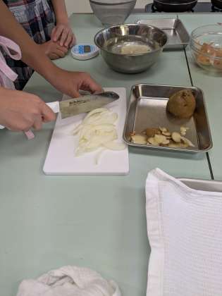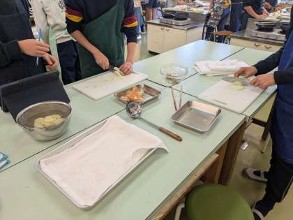 家庭科室からは、いいにおいがしてきました。6年生がジャーマンポテトを作るために、下ごしらえをしています。玉ねぎを切ったり、じゃがいもの皮をむいたり、ベーコンを切ったりしていました。