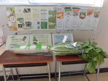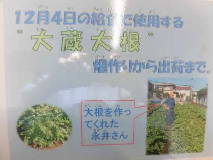 世田谷区のことについていろいろ学習している3年生の教室近くに、大蔵大根の実物を展示しました。今日の給食で使った大蔵大根を作ってくれた農家さん(永井さん)も紹介しました。