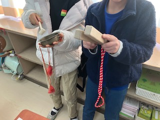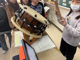 祭りばやしの勉強をして、実際に締め太鼓や鉦を触って音を出してみました。