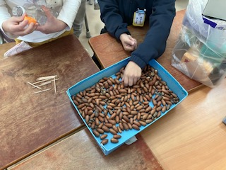 秋に集めたどんぐりを使って、いろんなおもちゃを作ります。どんなおもちゃで、どんな遊びができるかな?