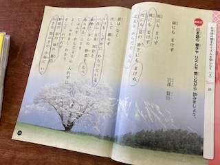 宮沢賢治の「雨にも負けず」の勉強をしていました、長い文章ですが、気に入った言葉をたくさん見つけて発表しました。