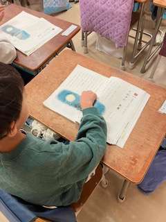 「たぬきの糸車」を読みました。お手本の朗読を聞きながら、自分の教科書を指でなぞりながら一緒に目で読みました。