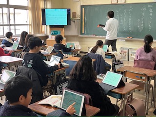 道徳で、自分の考えをタブレットに記入し、それ話みんなで共有していました。
