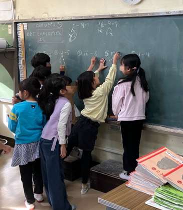 引き算の問題を、黒板に出てきて答えを書きました。繰り下がりももうスイスイできます♪