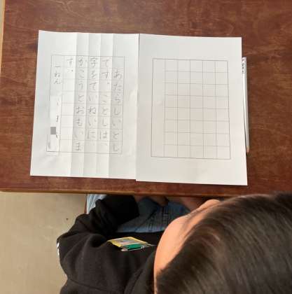お正月にお家で練習してきた書初め。いよいよ本番をします。
