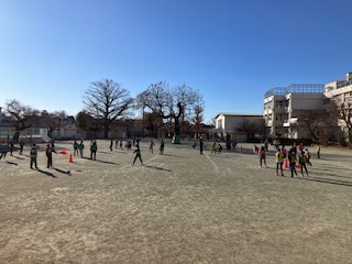 校庭でクラス合同での活動をしていました。この時期はお休みが多いですが、体を動かして、元気いっぱいです。