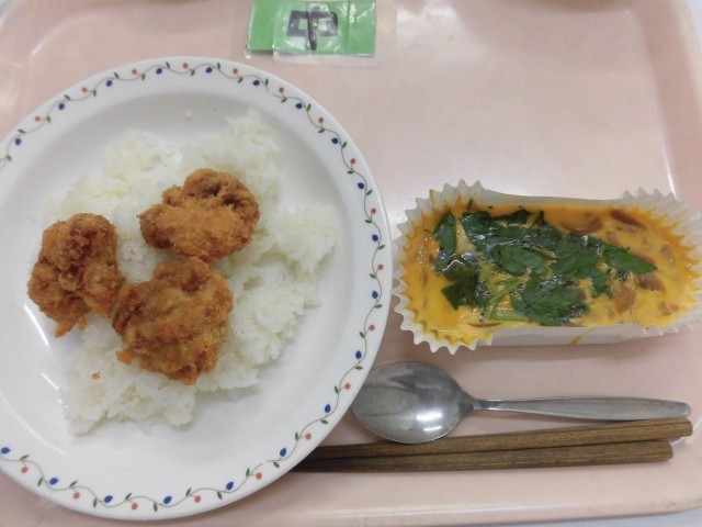 2.席についてから、各自がカツの上に、カップに入っている卵とじをのせる。