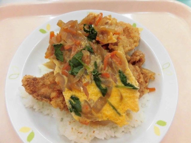 豚カツと具を一緒に卵でとじて提供することができないため、教室では次のようによそってもらうことにしました。