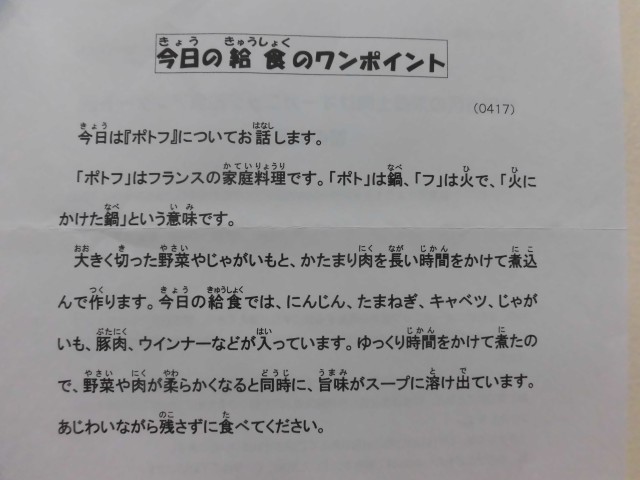 牛乳は少し残りましたが、他はほぼ完食でした。深沢小学校の給食に早く慣れてくれたら、と思います。