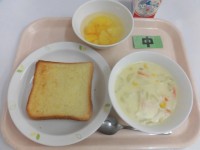 『今日の給食』 ガーリックトースト コーンシチュー フルーツポンチ 牛乳