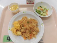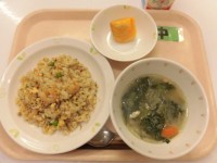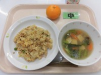 『今日の給食』 チャーハン 鶏肉と青菜のスープ 柿(次郎柿) 牛乳