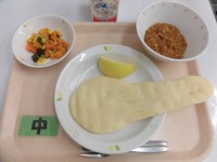 『今日の給食』 ナン キーマカレー かぼちゃサラダ りんご(皮つき) 牛乳今日の...