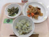『今日の給食』 さつまいもごはん がめ煮 青菜の乾物あえ 牛乳