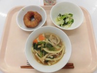 『今日の給食』 煮込みうどん 野菜のレモン醬油かけ ドーナッツ 牛乳