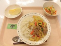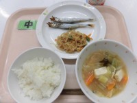 『今日の給食』 ごはん 焼きししゃも 切干大根の煮つけ キャベツのみそ汁 牛乳