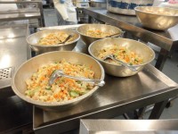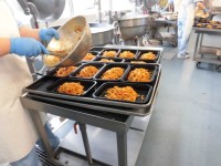 サラダの盛付の様子です。1.1枚の鉄板にカップが28個並べます。2.1つのボール...